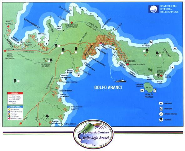 Golfo Aranci , cuyo nombre hace referencia no al vocablo italiano «arancia«, que en español significa «naranja» sino a la palabra «ranci» proveniente del dialecto sardo que quiere decir cangrejo. Erróneamente se le conoce así, no sólo por la familiaridad del nombre del Golfo con el fruto, sino también a una leyenda de antaño que cuenta que un barco repleto de naranjas naufragó en sus costas, pero siendo un pueblo de pescadores y que se pueden encontrar cangrejos fácilmente en ésta zona, resulta más convincente el origen sardo del nombre.